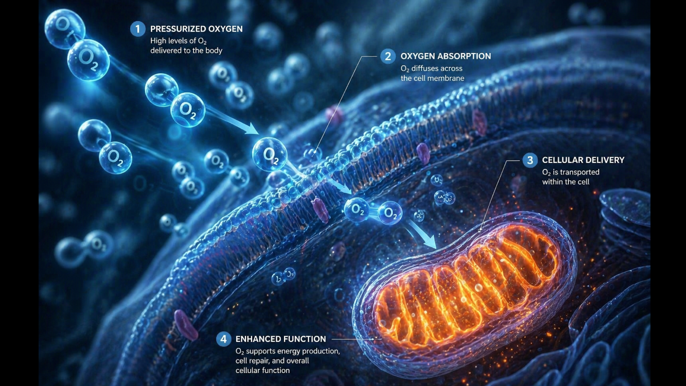 Hyperbaric oxygen therapy works by delivering concentrated oxygen under gentle pressure, pushing it directly into your blood plasma and tissues including areas where circulation is reduced.